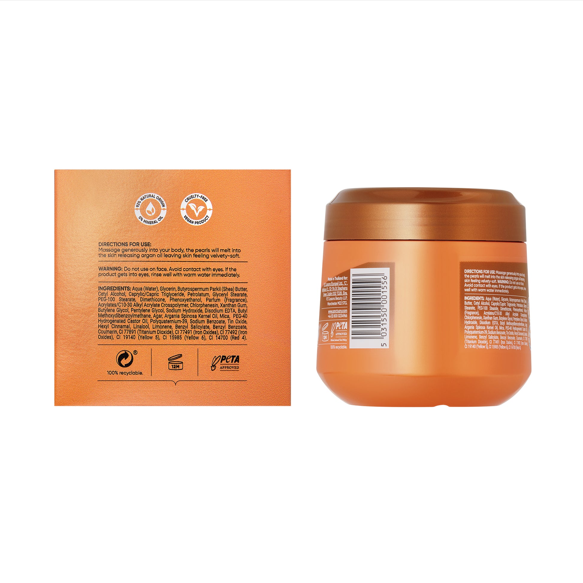 Zmes bambuckého masla a zapuzdrených perál marockého arganového oleja sa vpíja do pokožky a hĺbkovo ju vyživuje, zatiaľ čo vôňa jazmínu, grapefruitu a vanilky rozmaznáva zmysly. Zanecháva pokožku vyživenú a zamatovo hebkú až po dobu 7 dní.