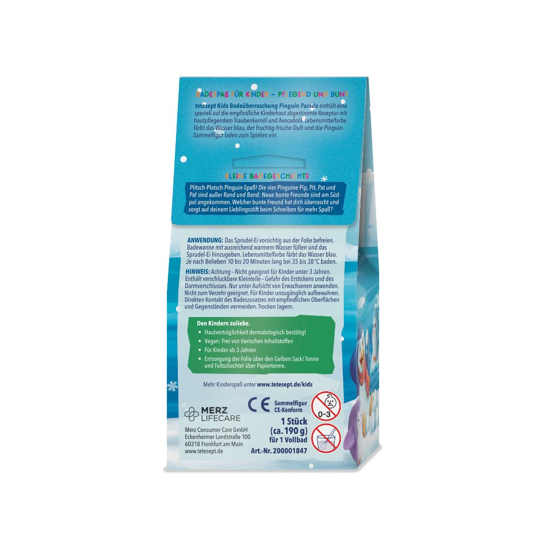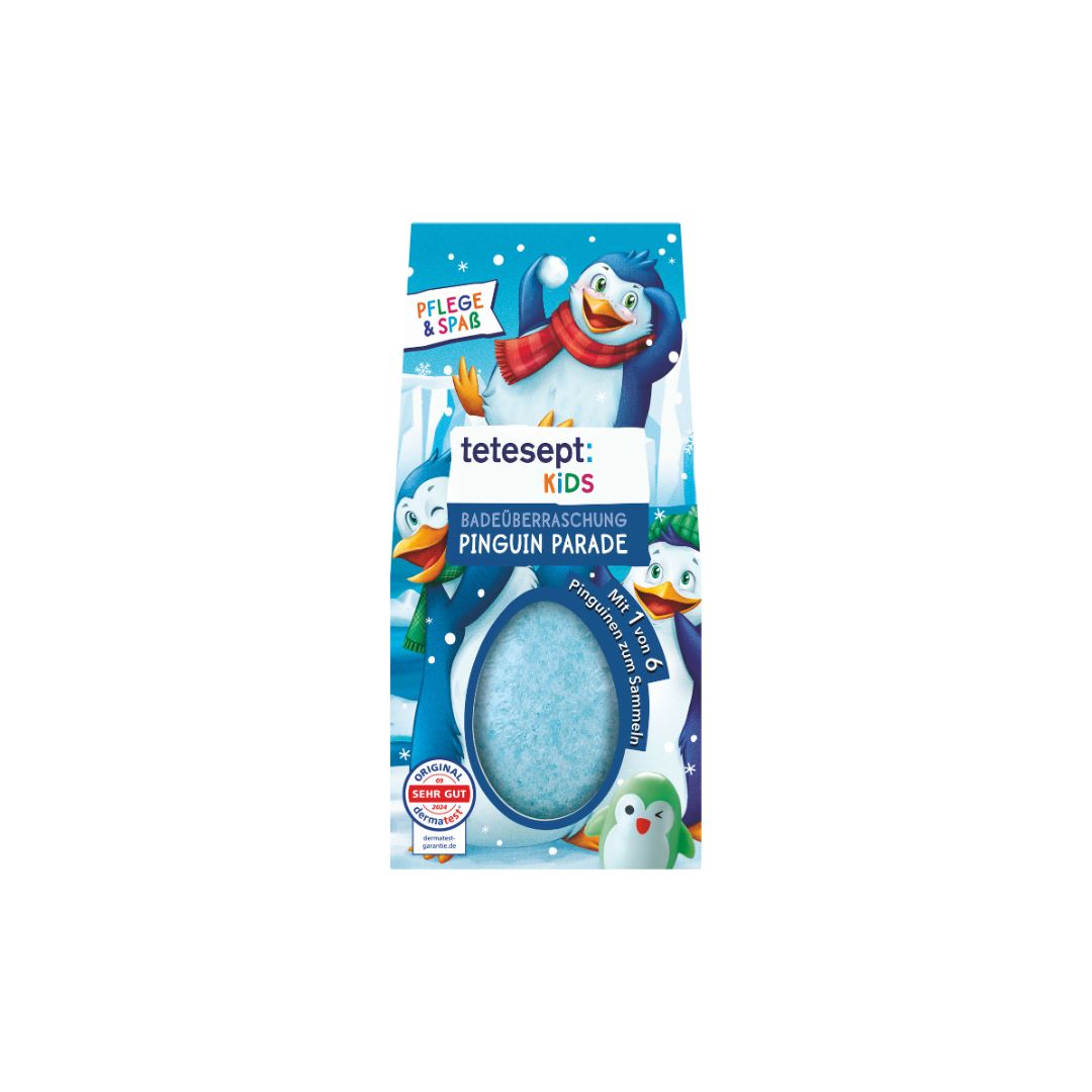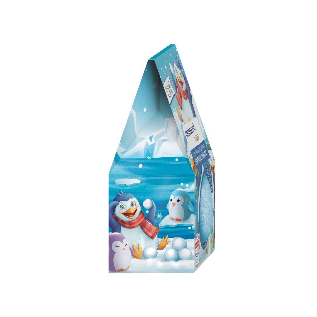 Tučniaky obsahujú zloženie špeciálne prispôsobené citlivej detskej pokožke, s ošetrujúcim olejom z hroznových semien a avokádovým olejom. Navyše zafarbia vodu na modro a prevonia kúpeľňu sviežou vôňou. Vo vnútri na vás čaká jeden zo šiestich tučniakov. Produkt je vegánsky a jeho znášanlivosť pokožkou bola dermatologicky potvrdená.