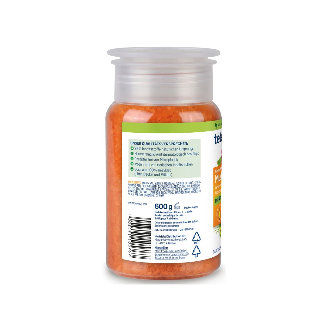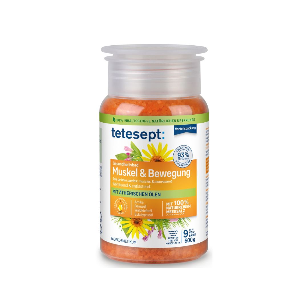 Kúpeľová soľ tetesept Svaly a pohyb je špeciálna prísada do kúpeľa, ktorá udržiava pokožku zdravú a podporuje úľavu a prehriatie napätých svalov. Unikátne zloženie kombinuje kostihoj, arniku, rozmarínový olej, olej zo škótskej borovice a eukalyptový olej.