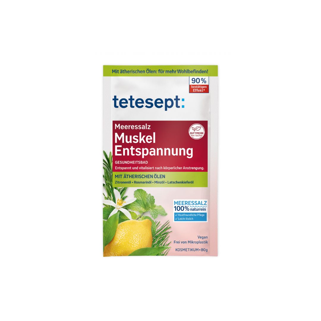 Soľ do kúpeľa tetesept Uvoľnenie svalov je špeciálna prísada do kúpeľa s prospešnou morskou soľou určená na relaxáciu a revitalizáciu unavených svalov. Unikátne zloženie kombinuje citrónový olej, borovicový olej, rozmarínový a mätový olej.